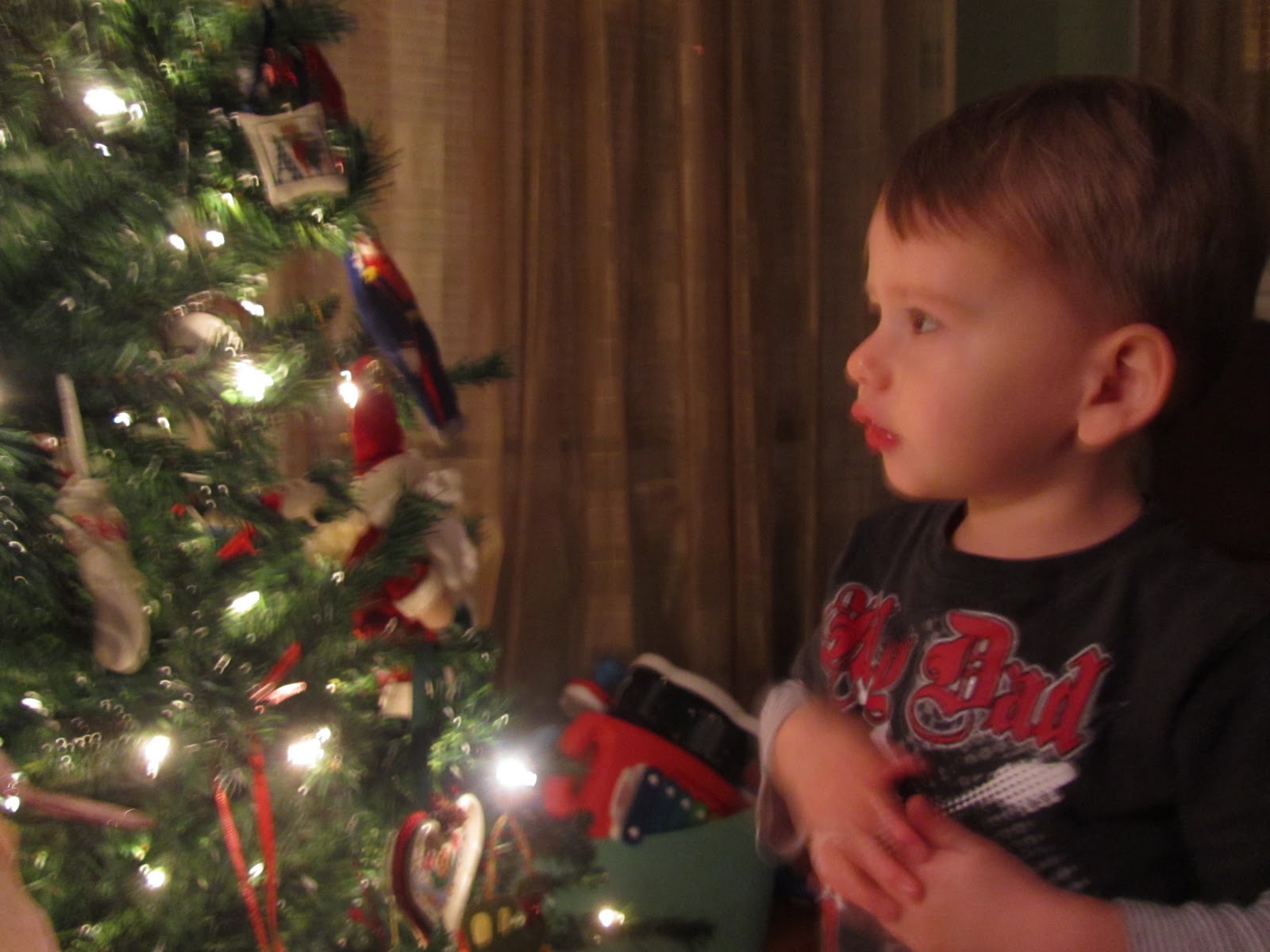 Silas is obsessed with an ornament tree that I set up for the first time this year. I caught him getting his nose really, really close to it.